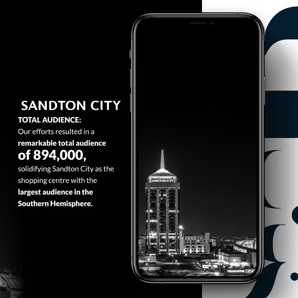 Facebook: Garnered a following of 768,000 devoted fans, marking a phenomenal growth rate of 14,876%. This translated to an average annual growth of 76,288 new followers. Instagram: From a humble starting point in 2014, we successfully built a loyal audience of 57,900 followers. Twitter: Our Twitter presence flourished, amassing 68,500 followers with an organic growth rate of 710%. On average, we gained 6,000 new followers per year through organic means. Average monthly reach: Reaching an astounding 3,000,000 screens per month, we achieved an impressive ROI of 3,000:1. Sandton City total audience: Our efforts resulted in a remarkable total audience of 894,000, solidifying Sandton City as the shopping centre with the largest audience in the Southern Hemisphere.
