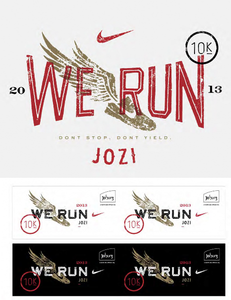 2013 WE RUN JOZI ELEMENTS – GANTRY, FENCING, STREET POLE FLAG MILE MARKERS, T-SHIRTS, MEDALS, BOWHEAD BANNERS, DOUBLE PAGE AD AND STREET WALLPAPER